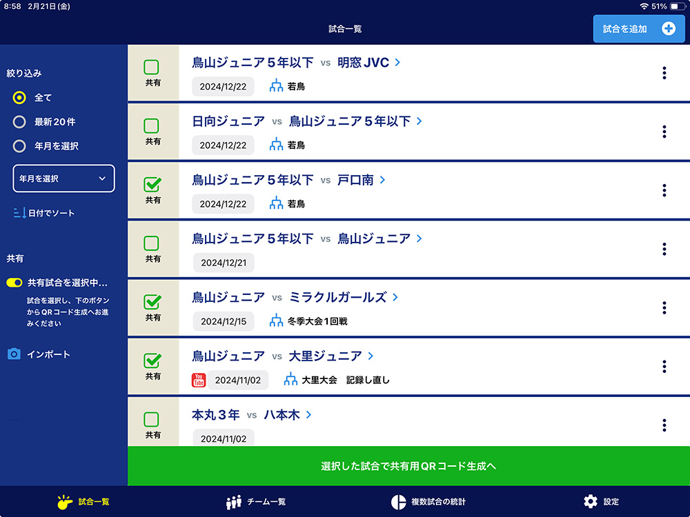 試合データの共有用コードをアプリ内で生成し、アプリ内で表示、またはSNSなどへ送信します。