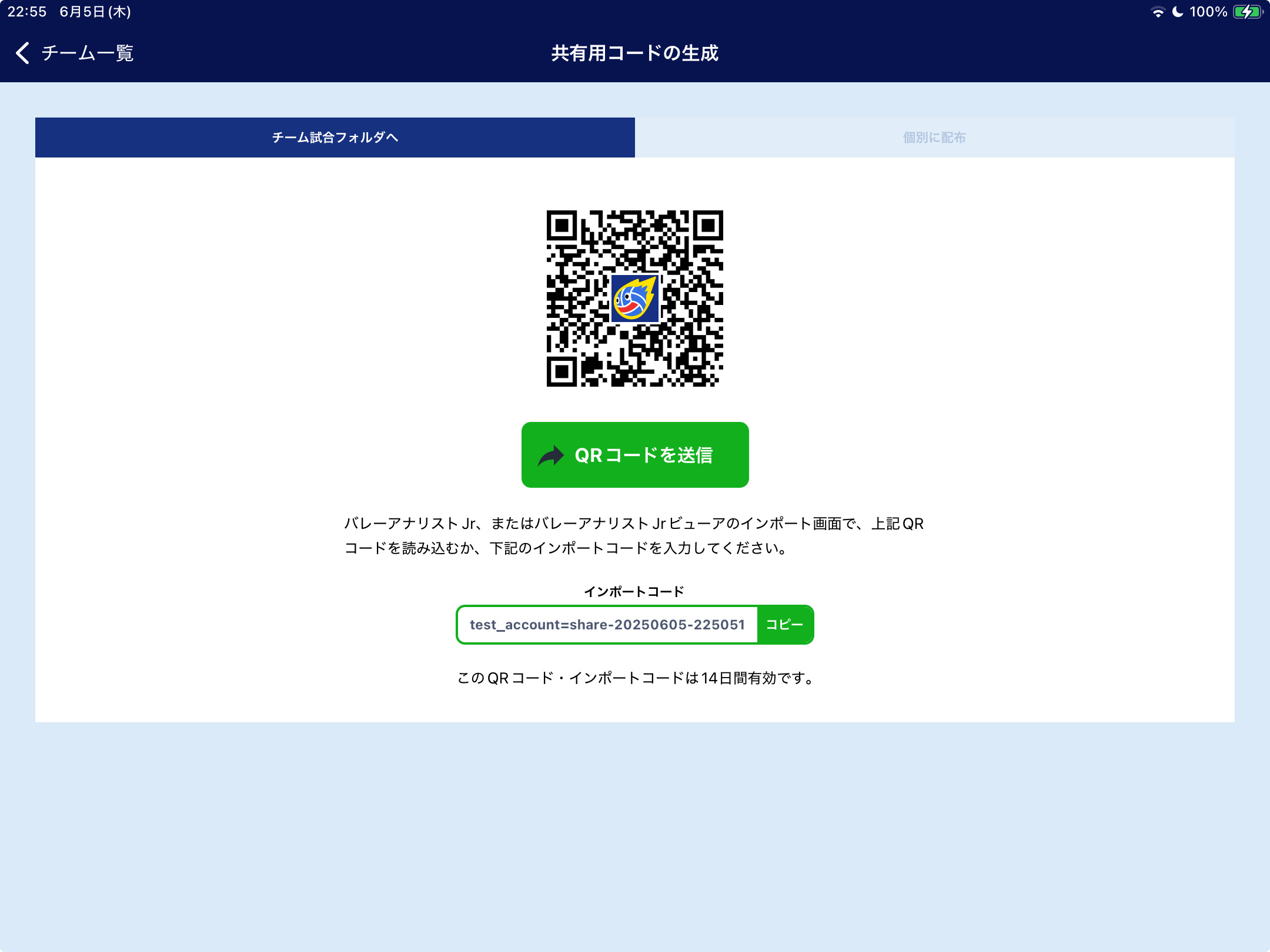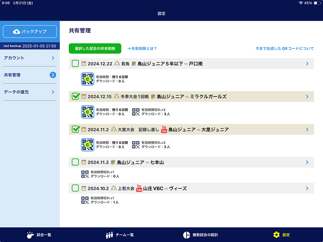 共有用コード(QRコード・インポートコード)の無効化、また共有用コードによって配布済みの試合データを、共有相手の端末から強制削除することができます。