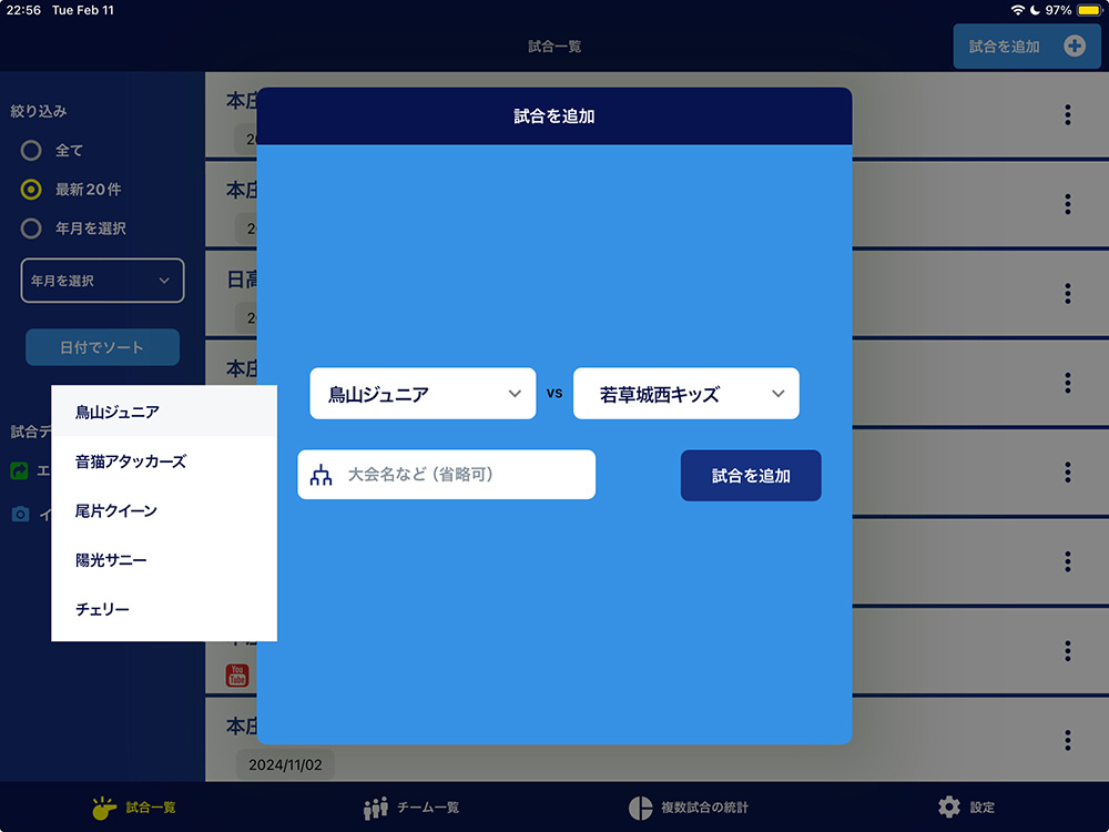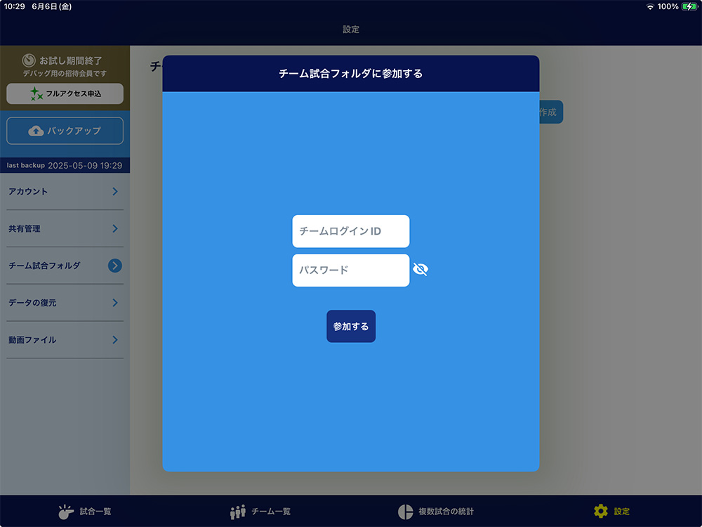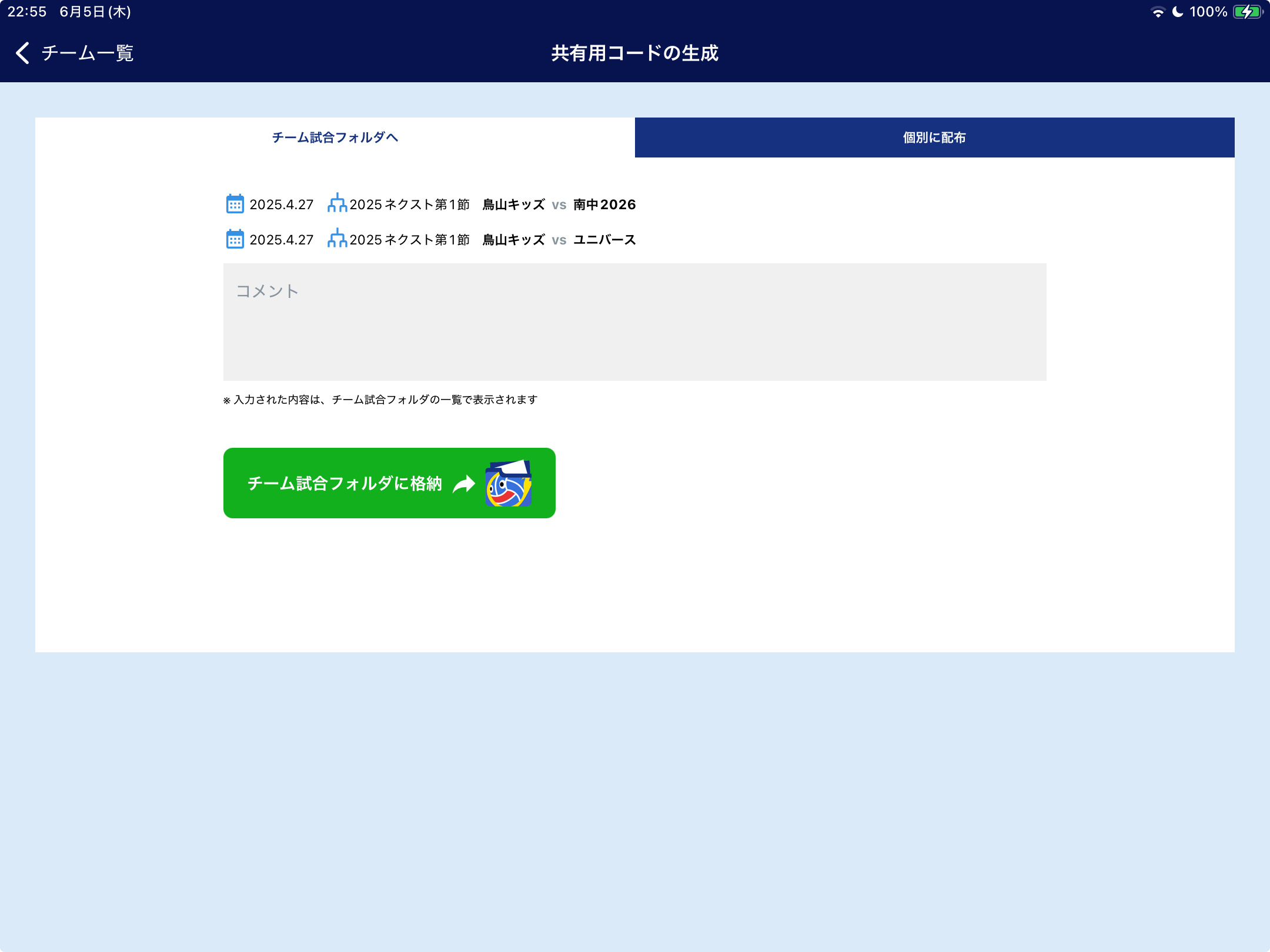 参加できるチーム試合フォルダは1つのみです。退会して別のチーム試合フォルダに参加することも可能です。