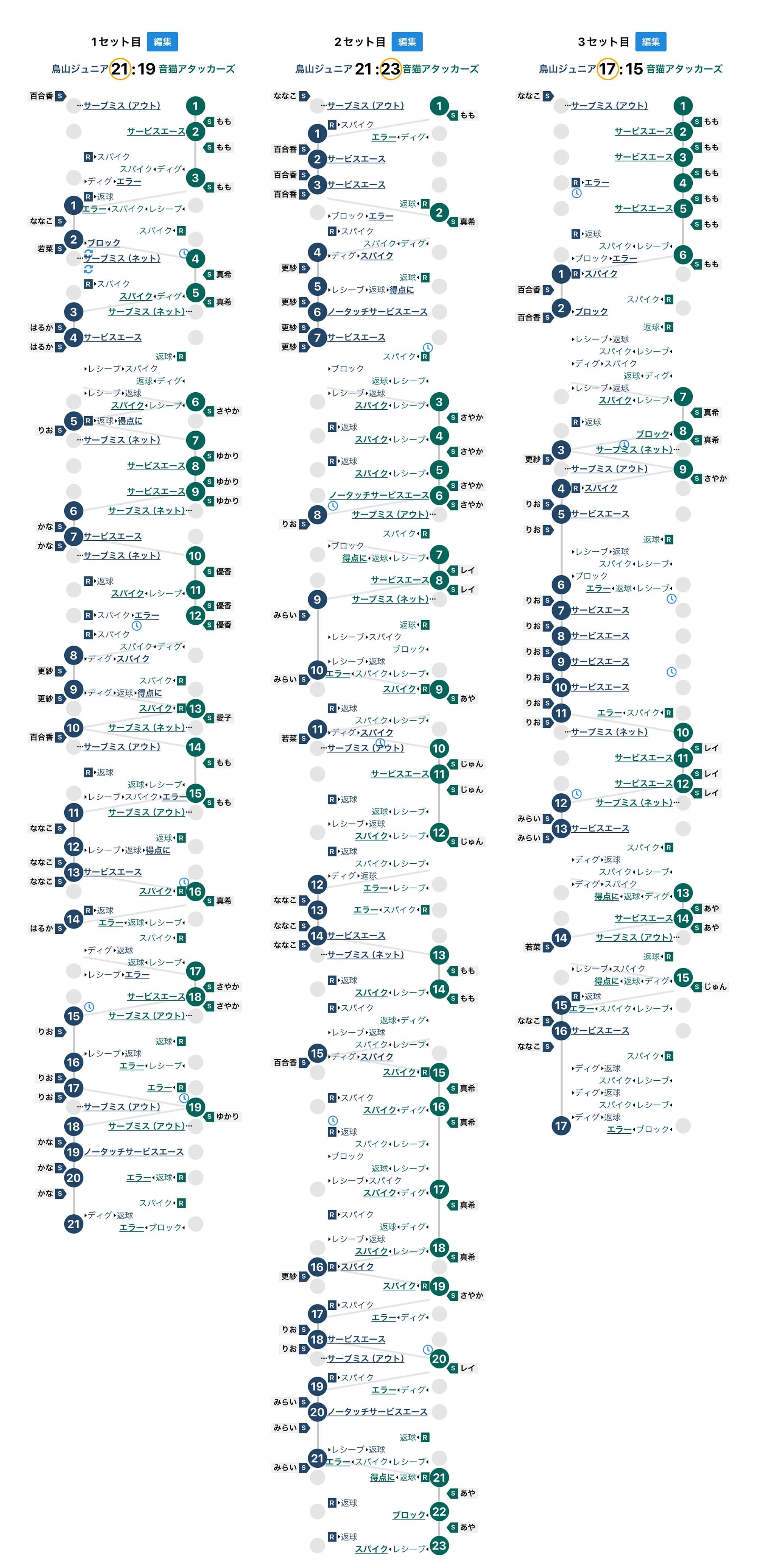 クリップ動画ではレシーブだけ、スパイクだけ、といった映像の再生ができます。※クリップ動画の再生開始時刻は、試合映像を見ながらボタンをタップしたタイミングになるので、プレーのタイミングとずれていた場合は次の❷詳しい記録 にて修正してください。